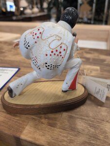 SpecificationsThe figure emphasizes a clean, sculptural silhouette with a bright white suit contrasted by red and gold detailing that trace the costume's seams and belt, while the dynamic pose suggests movement and on-stage energy. The wooden base provides a stable counterpoint to a glossy finish, aligning with display-focused, collectible sculpture aesthetics from mid-century rock-and-roll memorabilia.