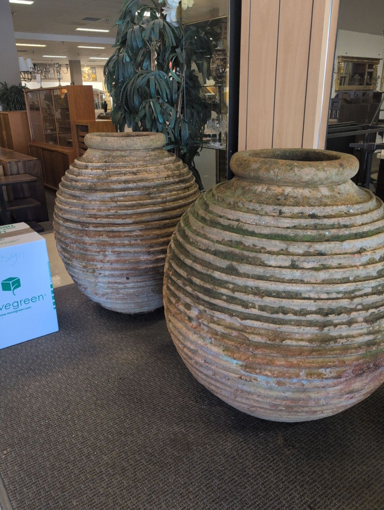 An antique terracotta olive oil jar with visible construction details that showcase its craftsmanship and history. This piece is perfect for adding a touch of character to any space.