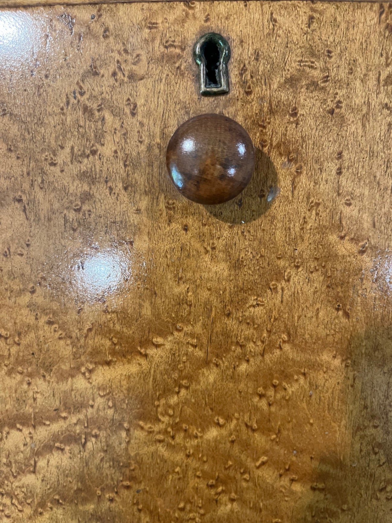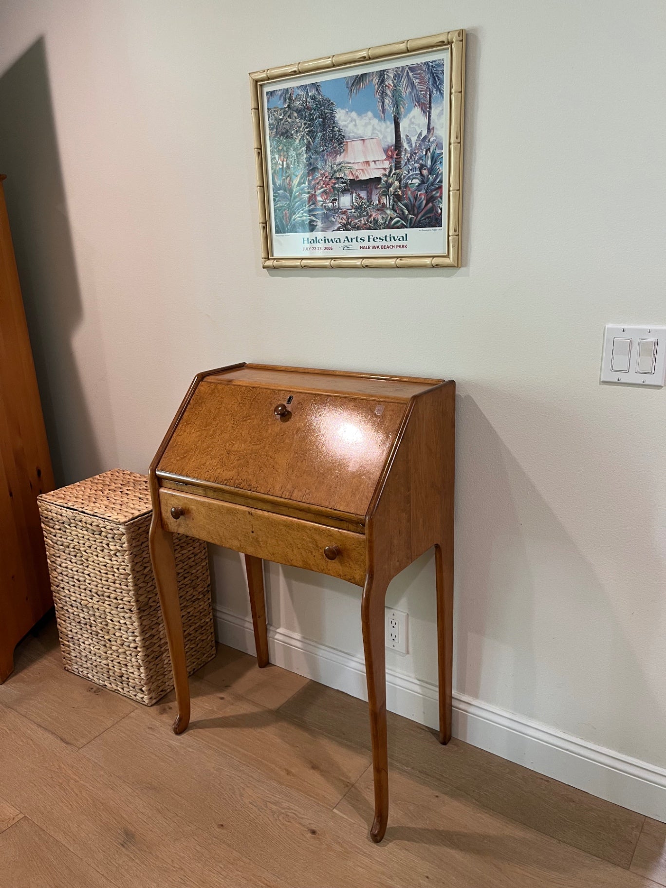 An antique French secretary desk with hand-carved details, made of oak wood. Features a fold-down writing surface and multiple drawers for storage.