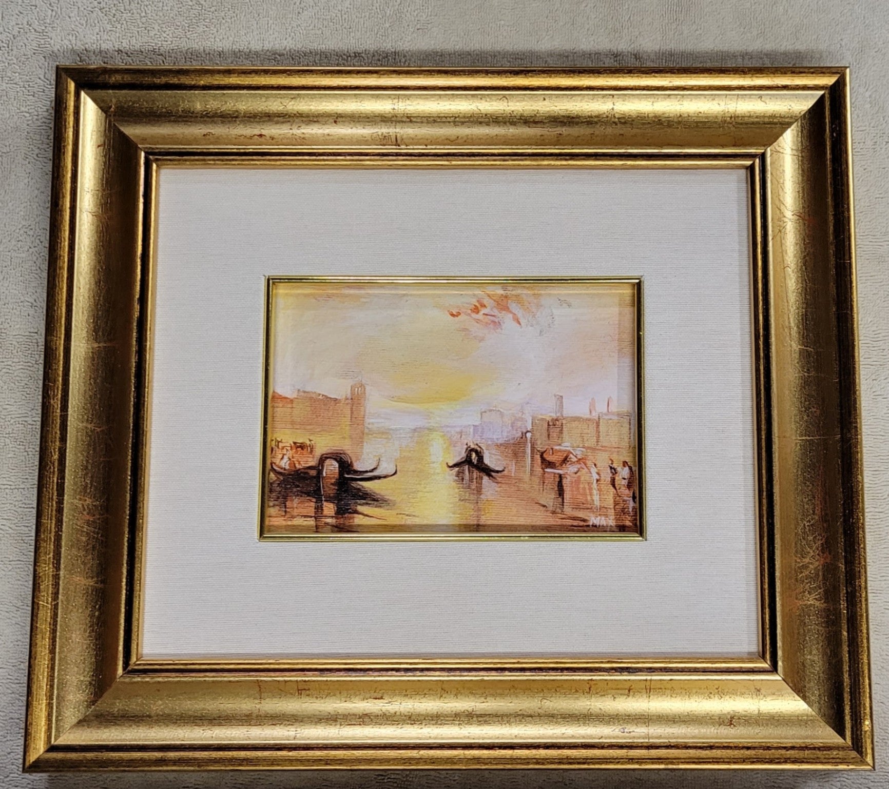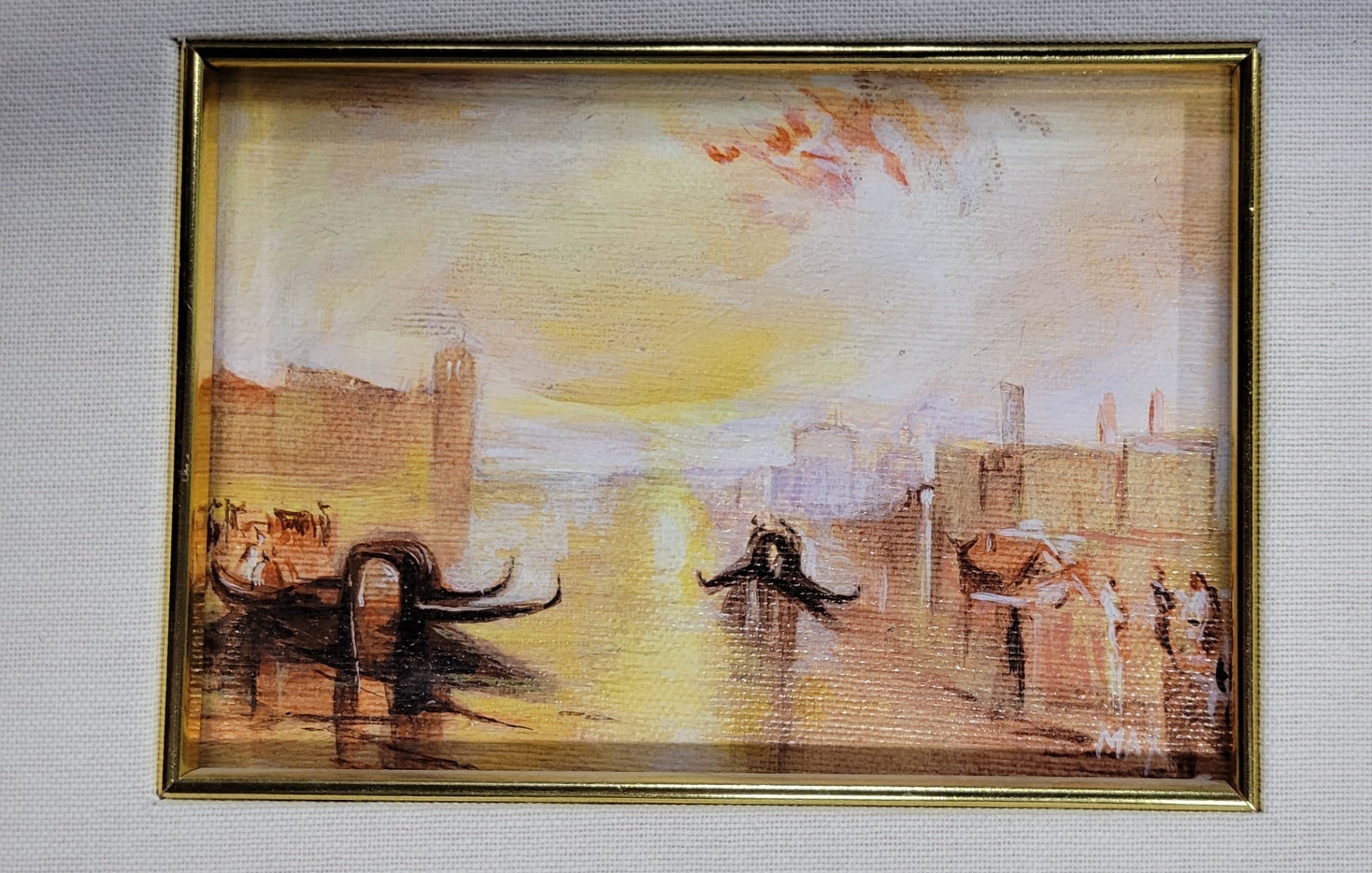 A framed watercolor painting depicting a cityscape with elephants in a river during sunset. The artwork features warm tones of yellow, orange, and brown with loose brushwork and an impressionistic style. The frame is gold-colored and surrounds the painting.