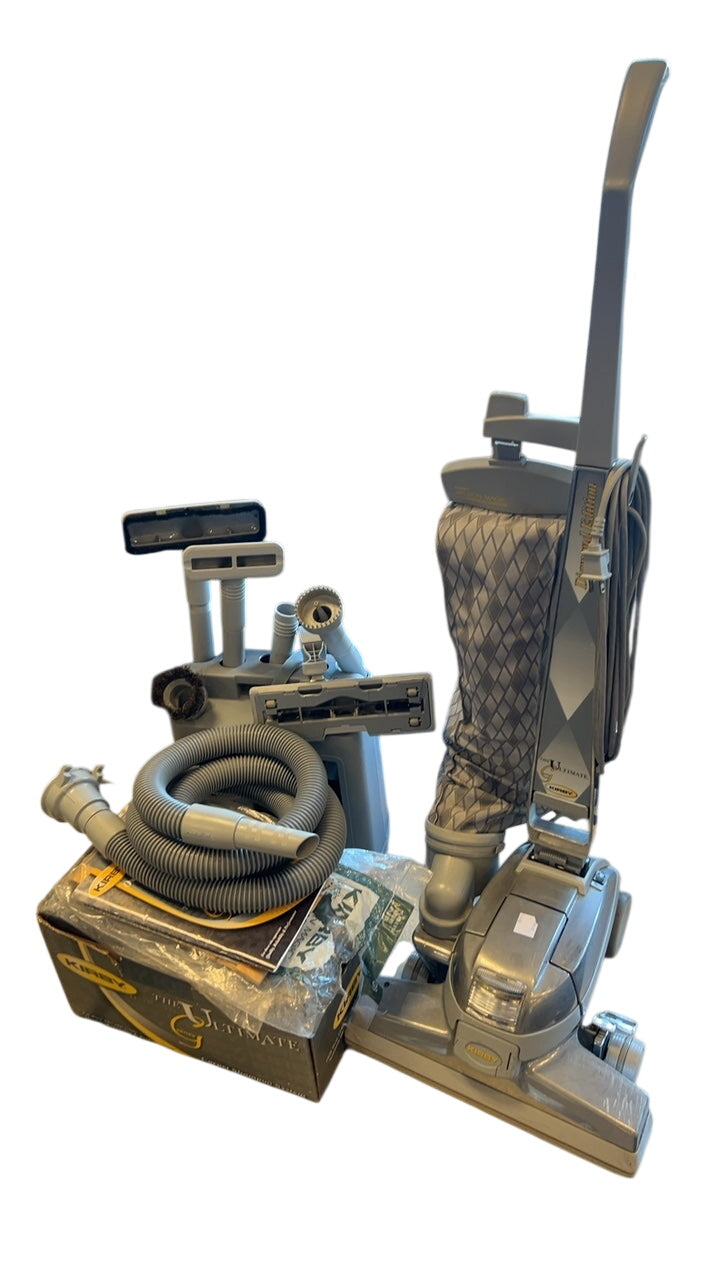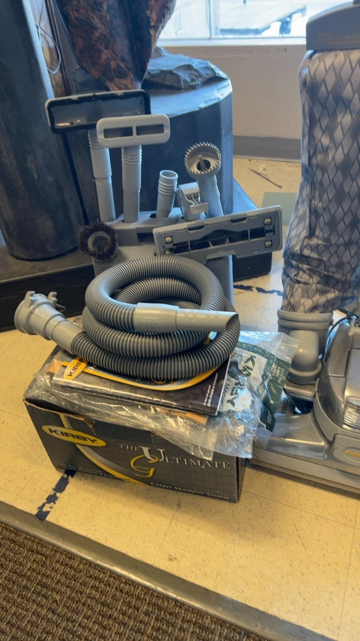 This Kirby vacuum cleaner comes with various attachments for different cleaning needs. The unit is likely made from durable materials and is designed for efficient cleaning in various spaces.