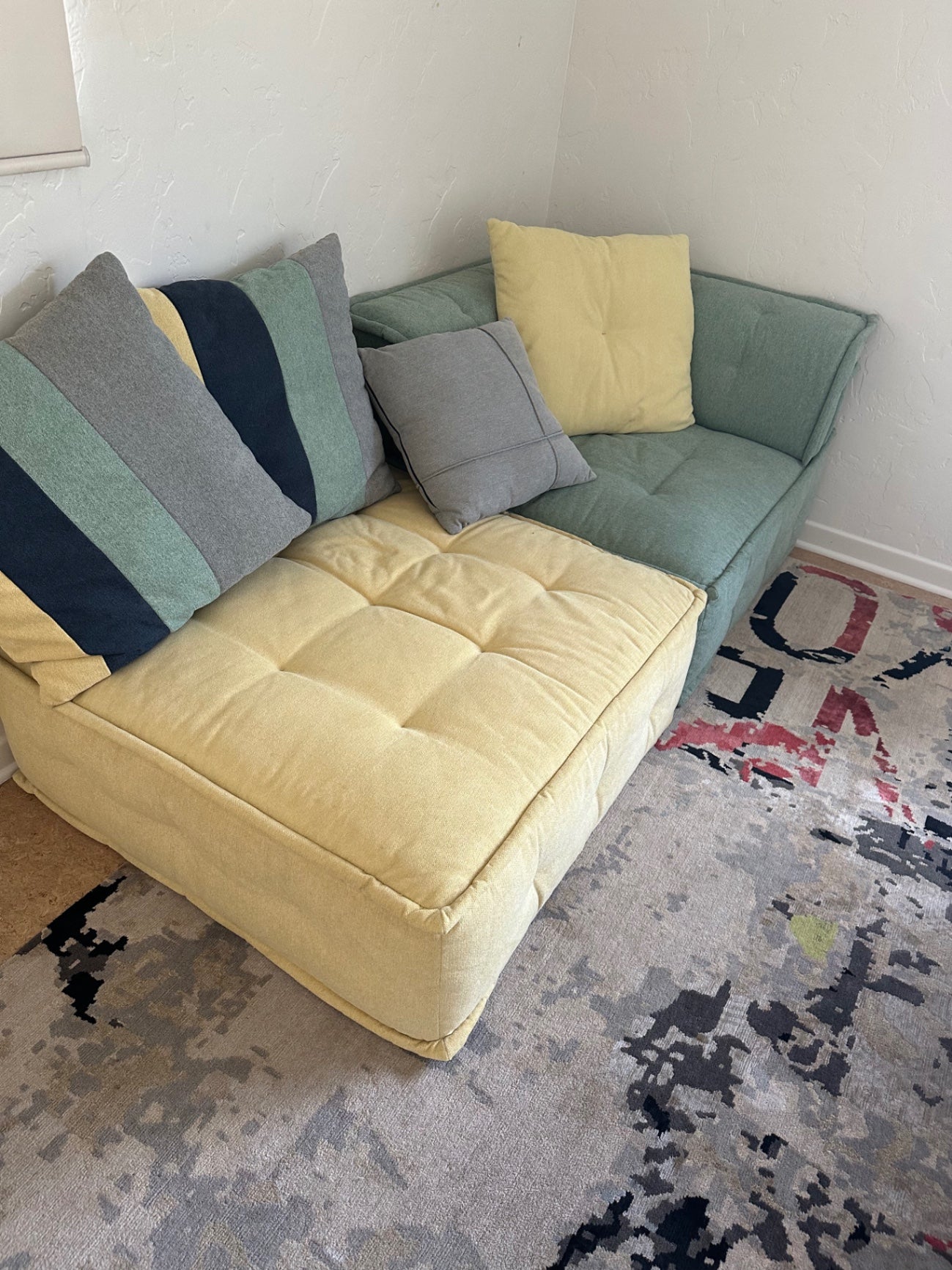 Sectional sofa composed of 3 colorful upholstered sections, with multiple throw pillows in various fabrics and colors. The left section is yellow and the right section is green. the third section (not pictired) matches the 2 shown. great fir playroom or kids room.