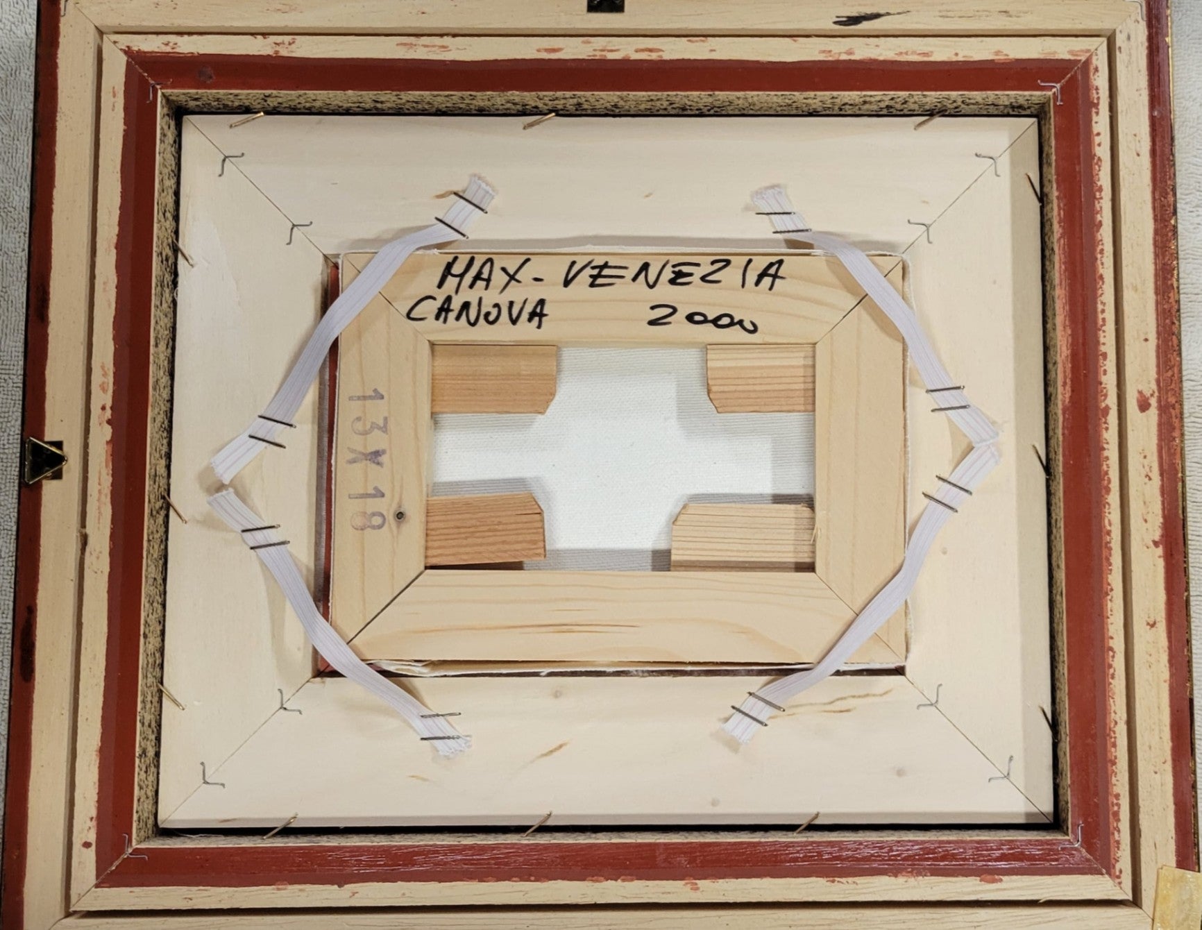 The image shows the back of a framed canvas artwork, with the wooden frame and hanging mechanism visible. The frame is constructed from pine wood, with handwritten text indicating it is from Max Venezia, with a size of 200 cm. The back is reinforced with staples and includes a hanging string secured with staples around the perimeter of the back frame, used for mounting on a wall. The outer frame appears to be aged with a distressed finish, while the inner frame is in natural wood, designed to support a canvas or similar surface for decorative purposes. No other materials or adornments are visible in the image.