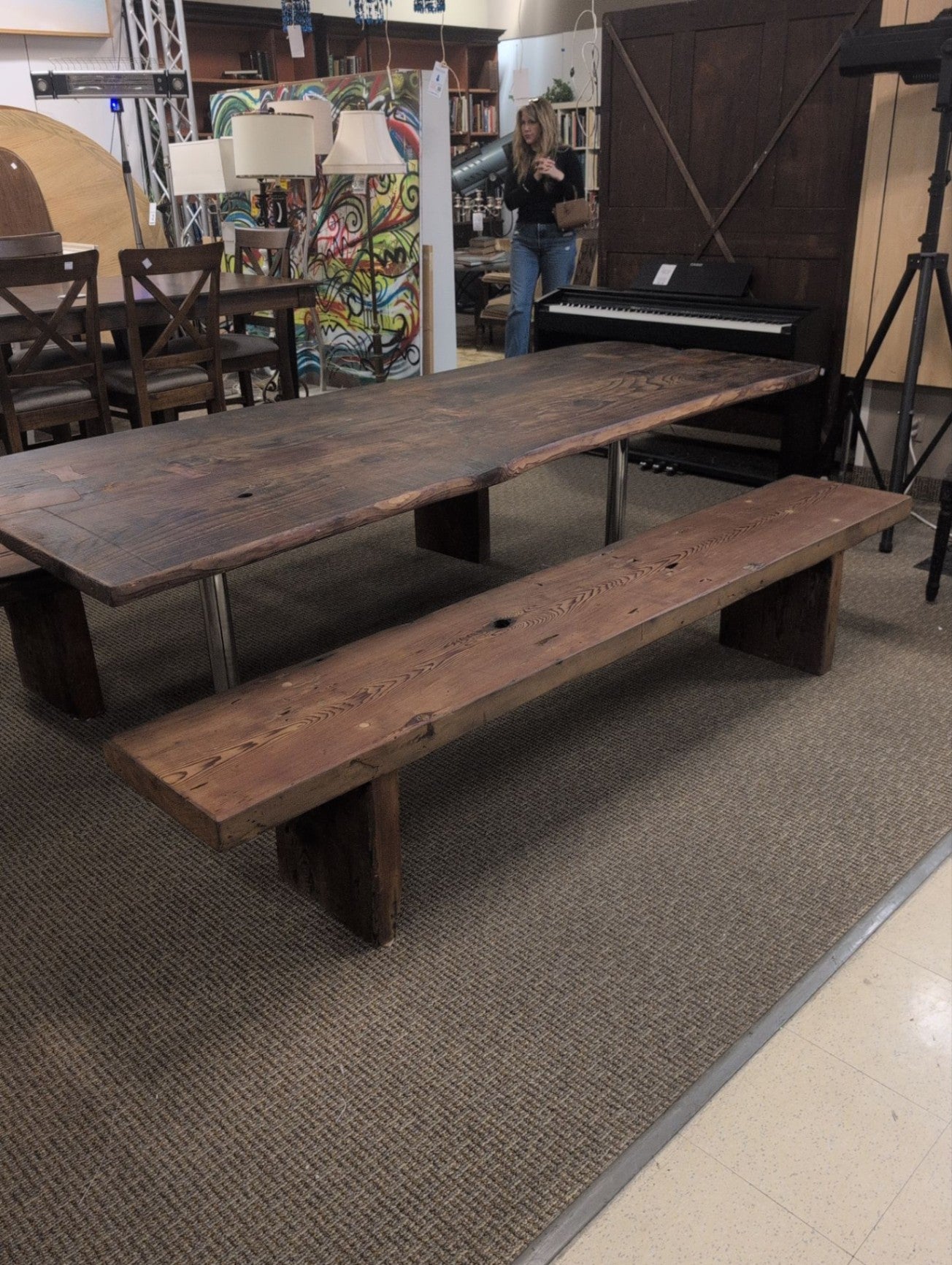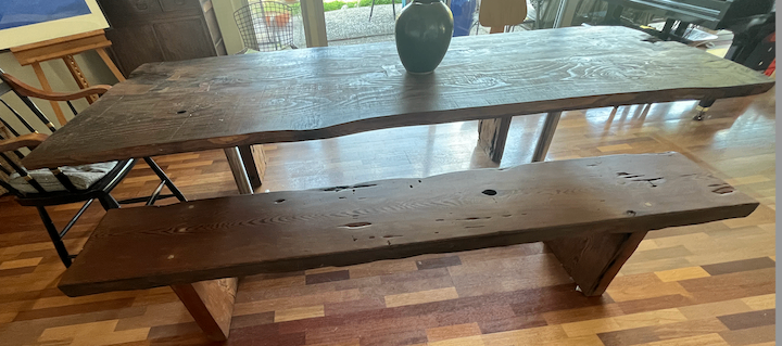 A dining table set consisting of a long rectangular wooden table with a rustic finish, supported by chrome metal legs. Accompanying the table is a matching wooden bench with a similar finish and sturdy construction. The wood has visible grain and knots, contributing to a rustic aesthetic. The table and bench are situated on a hardwood floor in a dining area.