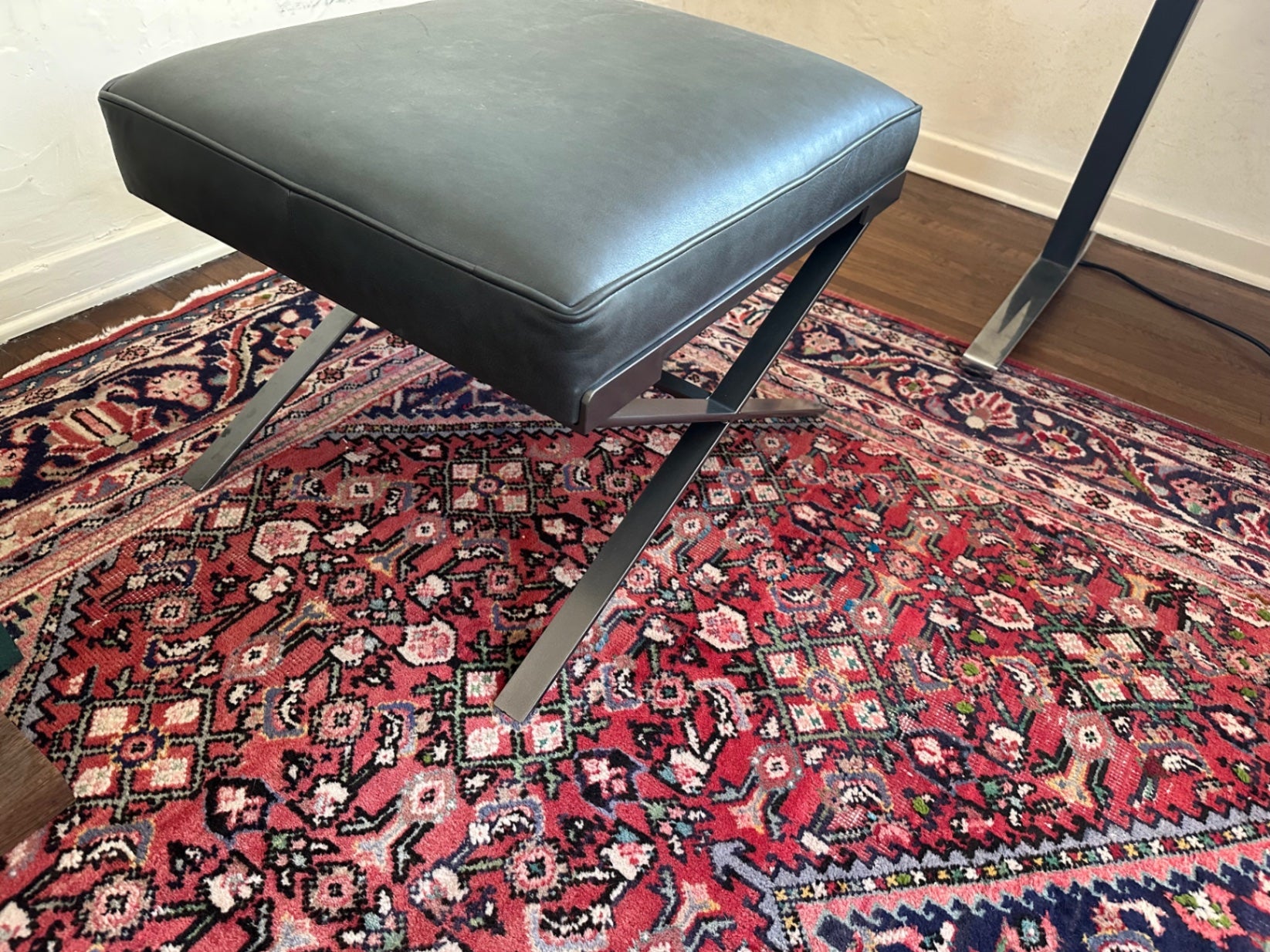 A stylish ottoman/stool by CR Laine featuring leather upholstery and steel frame. Great for additional seating or as a footrest.