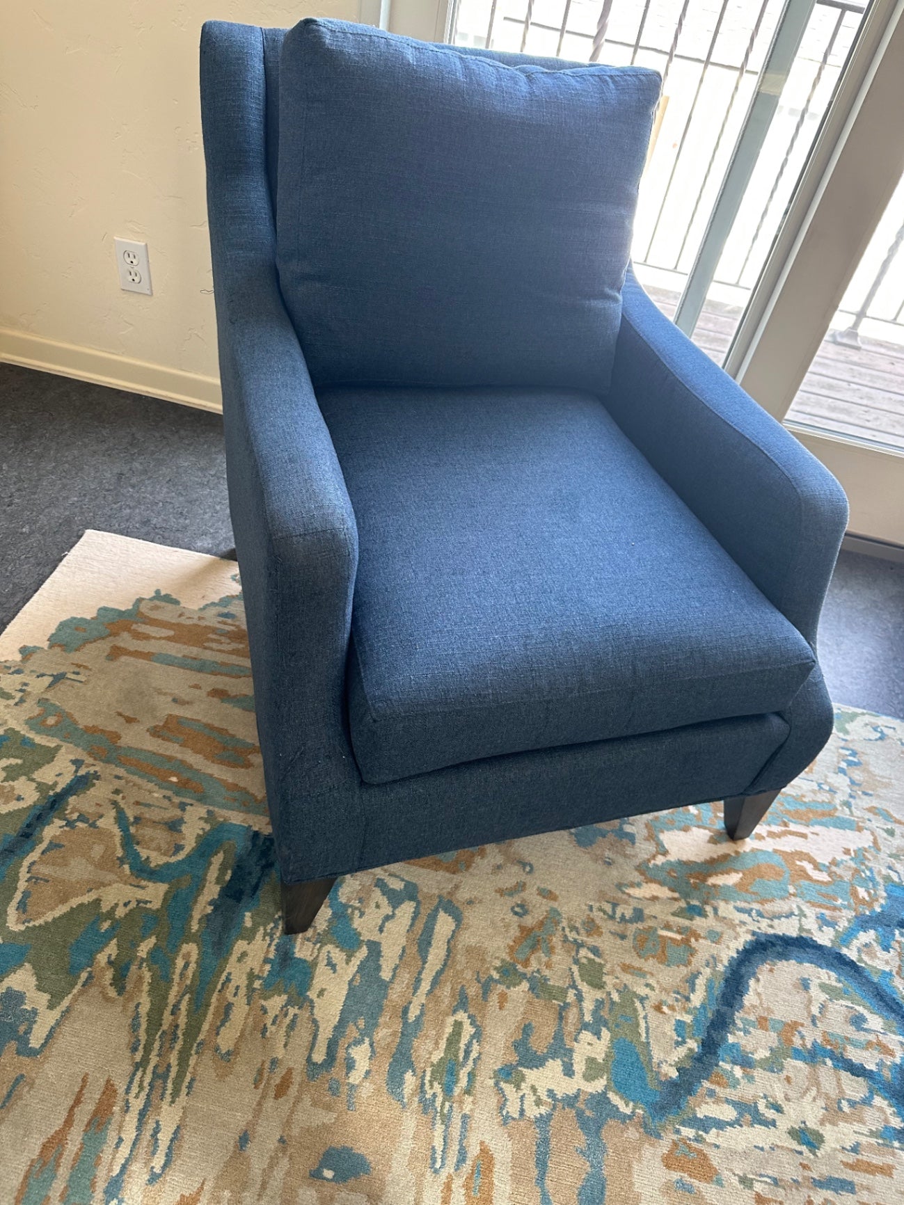 This CR Laine blue upholstered club armchair features a comfortable design with sturdy construction. Perfect for a cozy reading nook or living room accent piece.