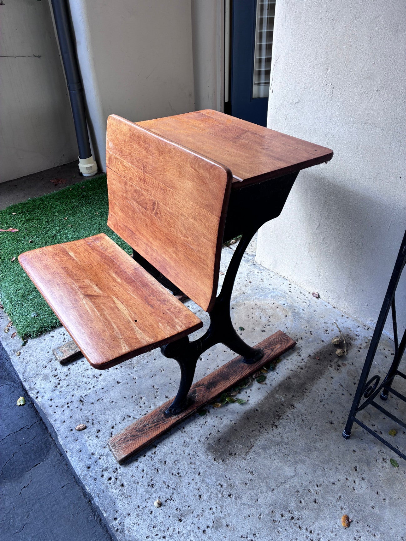 This antique school desk features a classic design with a wooden construction. The desk includes a slanted table surface with a storage compartment underneath. Wooden school desk, bench folds, and handy spot for your pen and bottle of ink 29" tall 26 1/2" deep 20 1/4" wide