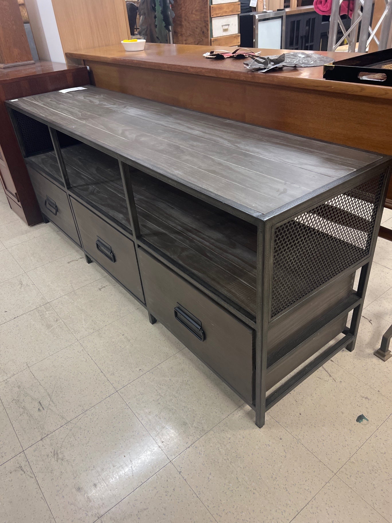 Restoration Hardware Media Console made of solid wood with metal accents. Designed to hold various media equipment in a modern living space.