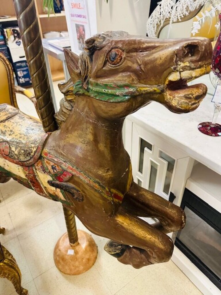 Early 20th century carved wood carousel horse with brass pole and painted details, featuring classic form and age-appropriate surface wear.
