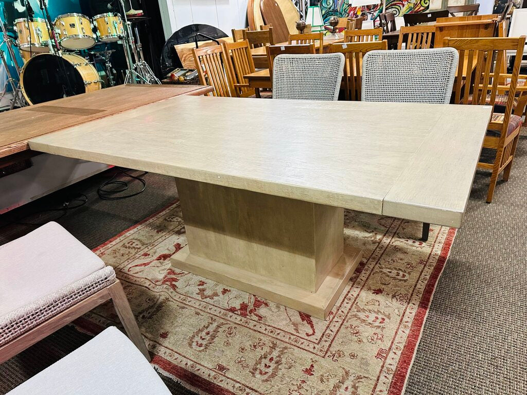 Blonde wood pedestal table. Approx. 42.5 in H 72 in W 30 in D.
