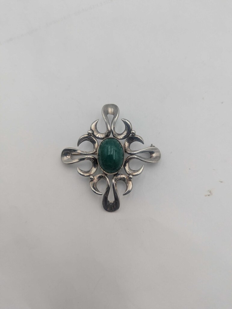 Brooch Sterling Silver w/ Green Stone Flower Shape