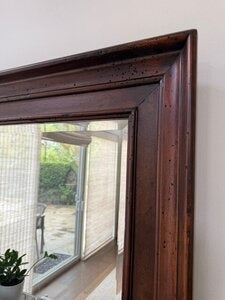 This rectangular wall-mounted mirror is defined by a dark-stained wooden frame surrounding a beveled glass surface. The solid wood construction provides a sturdy surround that supports long-term use, while the beveled edges introduce subtle depth to reflected light. The restrained profile and natural material palette enable versatile placement in hallways, bathrooms, bedrooms, or living areas, pairing well with traditional, transitional, or contemporary interiors.