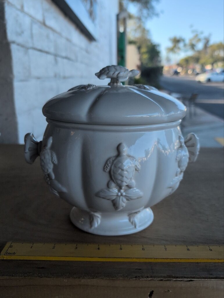 Covered White Ceramic Turtle Motif Jar