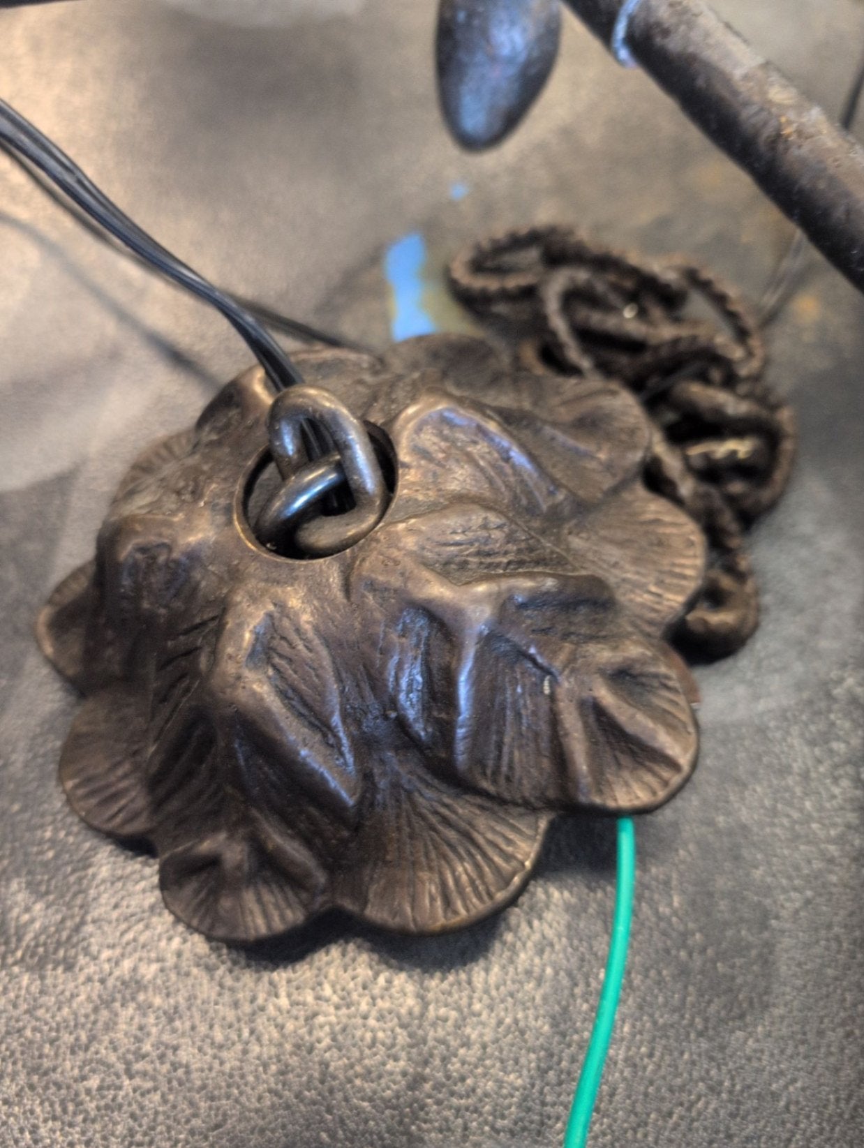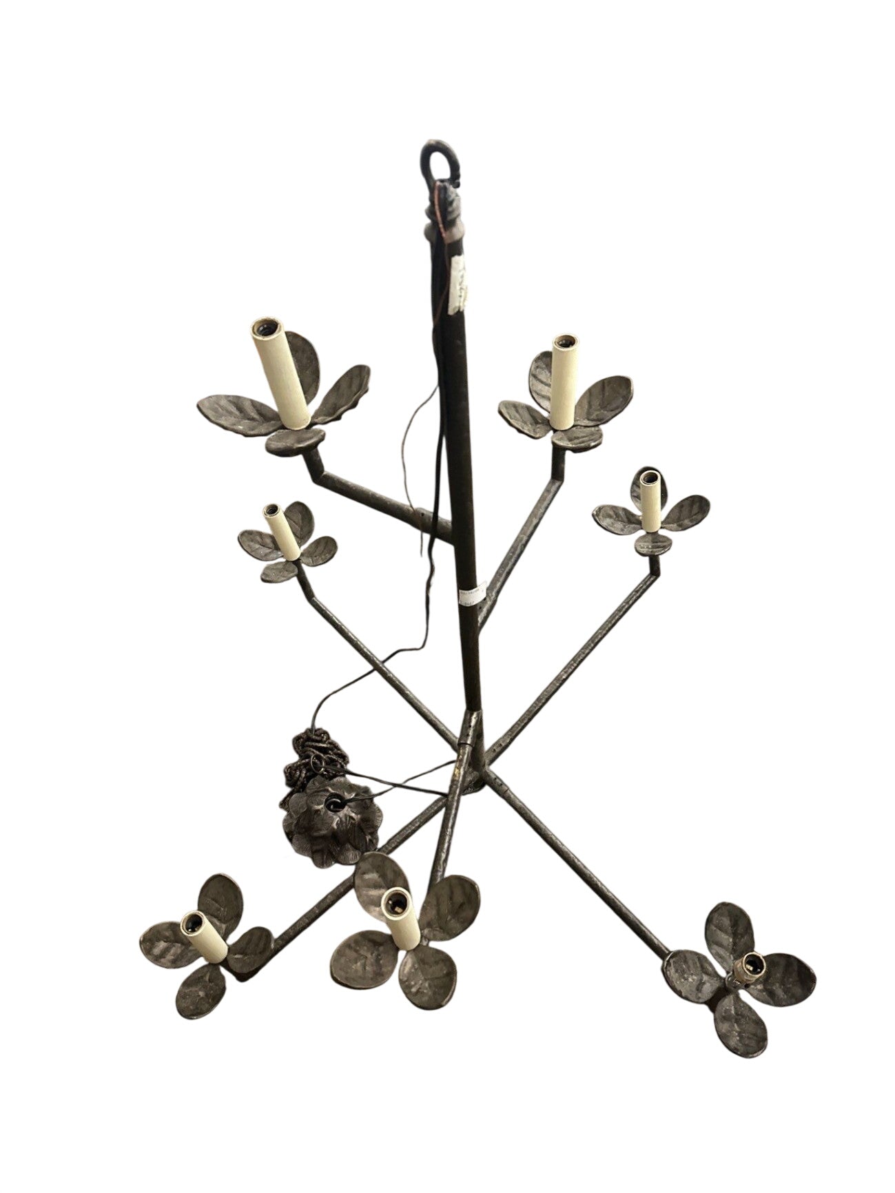 Iron leaf motif angular chandelier with a unique design.