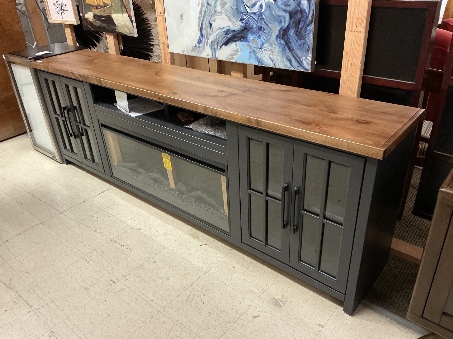 The TV stand features a classic silhouette with a fireplace insert, adding a cozy ambiance to the room. The solid wood construction provides a sturdy base for your TV and other electronics.
