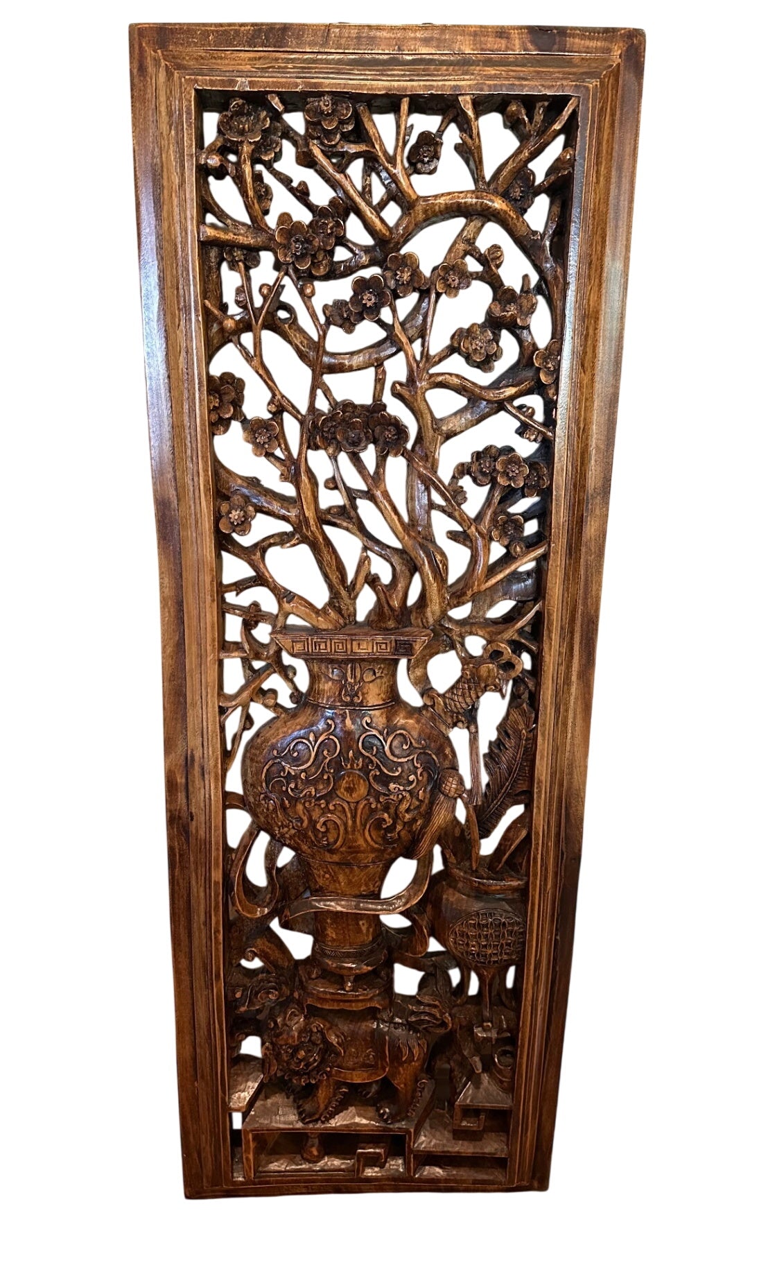 The wall panel showcases traditional Chinese carving techniques with a floral motif and geometric patterns.