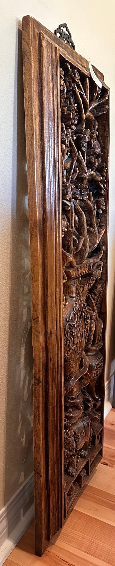 This Chinese hand-carved wood wall panel features intricate detailing and craftsmanship. The piece is made of solid wood with traditional carvings.