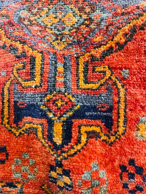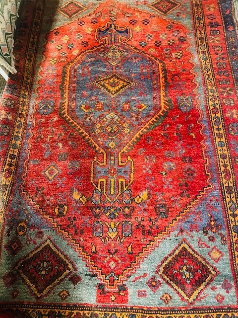 This hand woven Persian rug features intricate patterns and vibrant colors. Made with high-quality wool, it adds a touch of elegance to any space.