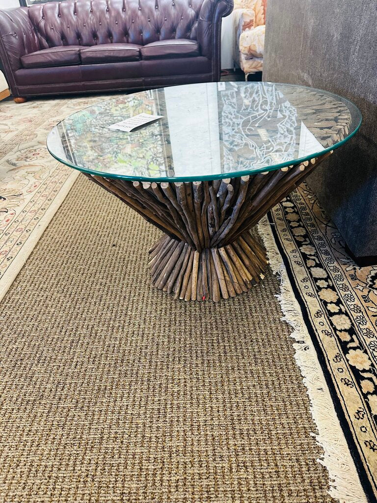 Round glass-top coffee table with sculptural base. The transparent surface keeps the look open while the base adds visual interest to a living space.