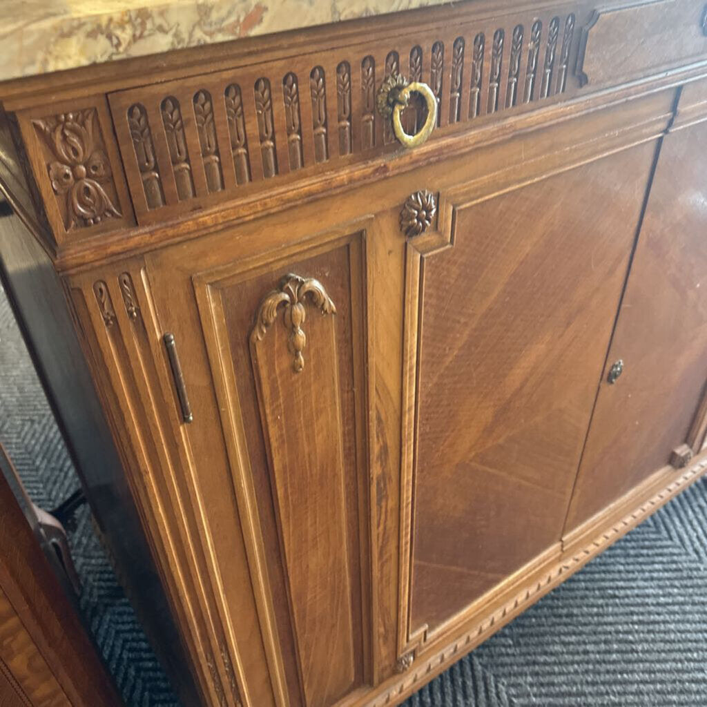 Henry Fuldner & Son Marble-Top Cabinet. Vintage wood cabinet or bureau with marble top. Approx. 44 in H 48 in W 23 in D.