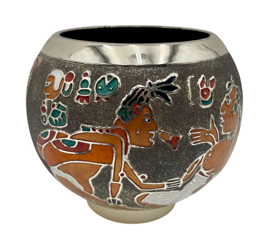 3.6"H x 4.25"Dia. Excellent Condition Signed Miguel Pineda Mexican Neo Myan Aztec Silver Enameled Footed Bowl 3.6"
