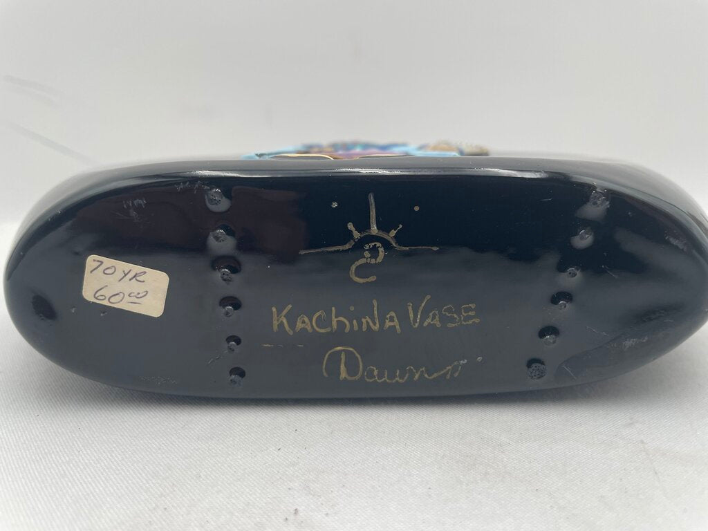 7.75"H x 7.5"W x 2"D Excellent Condition Signed Native American Navajo Kopa Black Glaze Painted Relief Kachina Vase by Dawn
