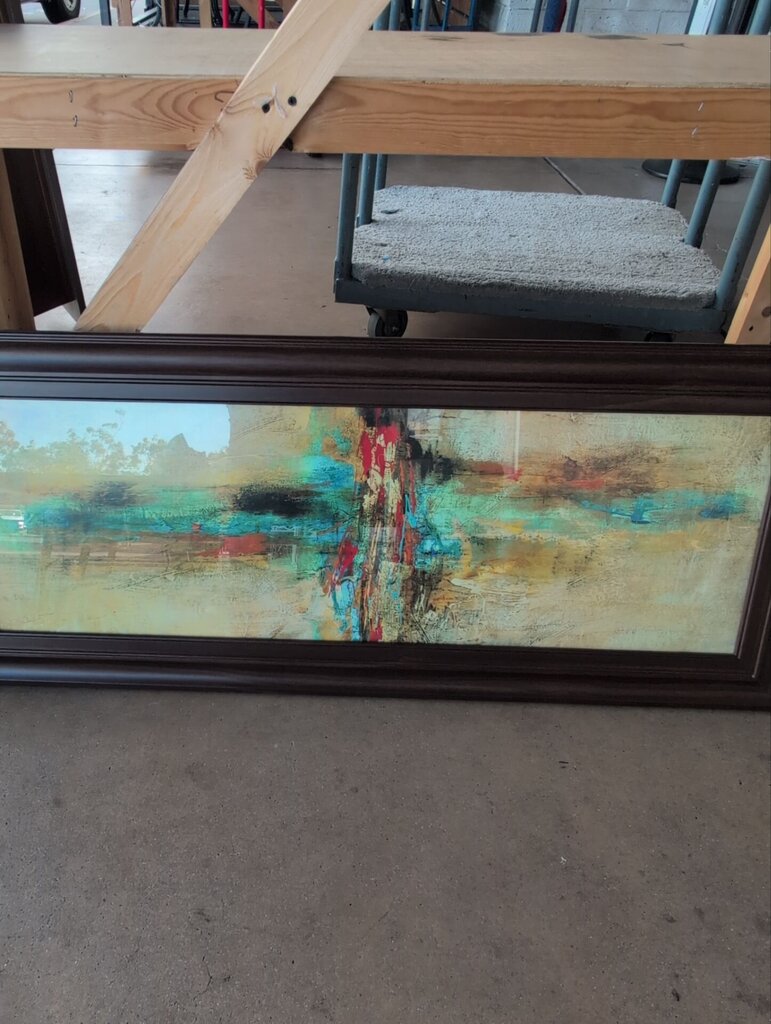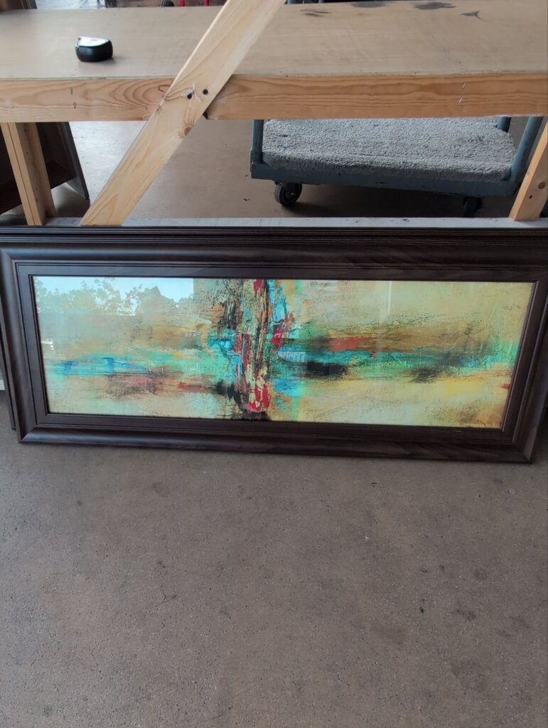 Pair of abstract framed art pieces in golds, greens, reds, and yellows from consignor intake.