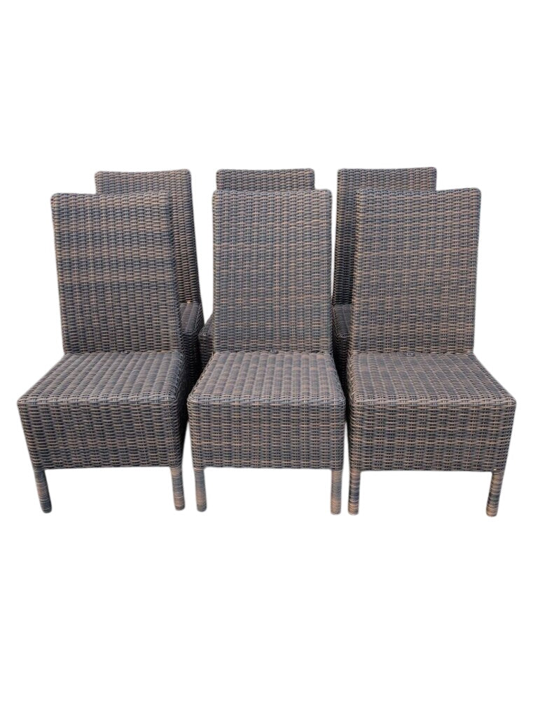 Set of six high back outdoor wicker dining chairs from consignor intake.