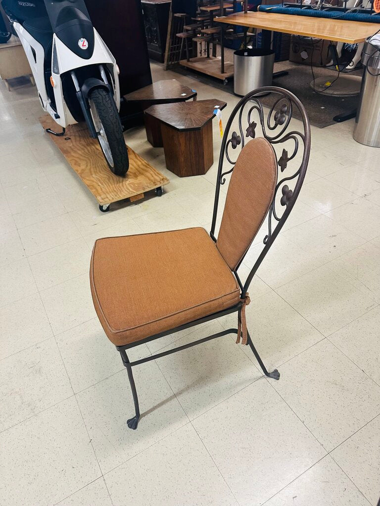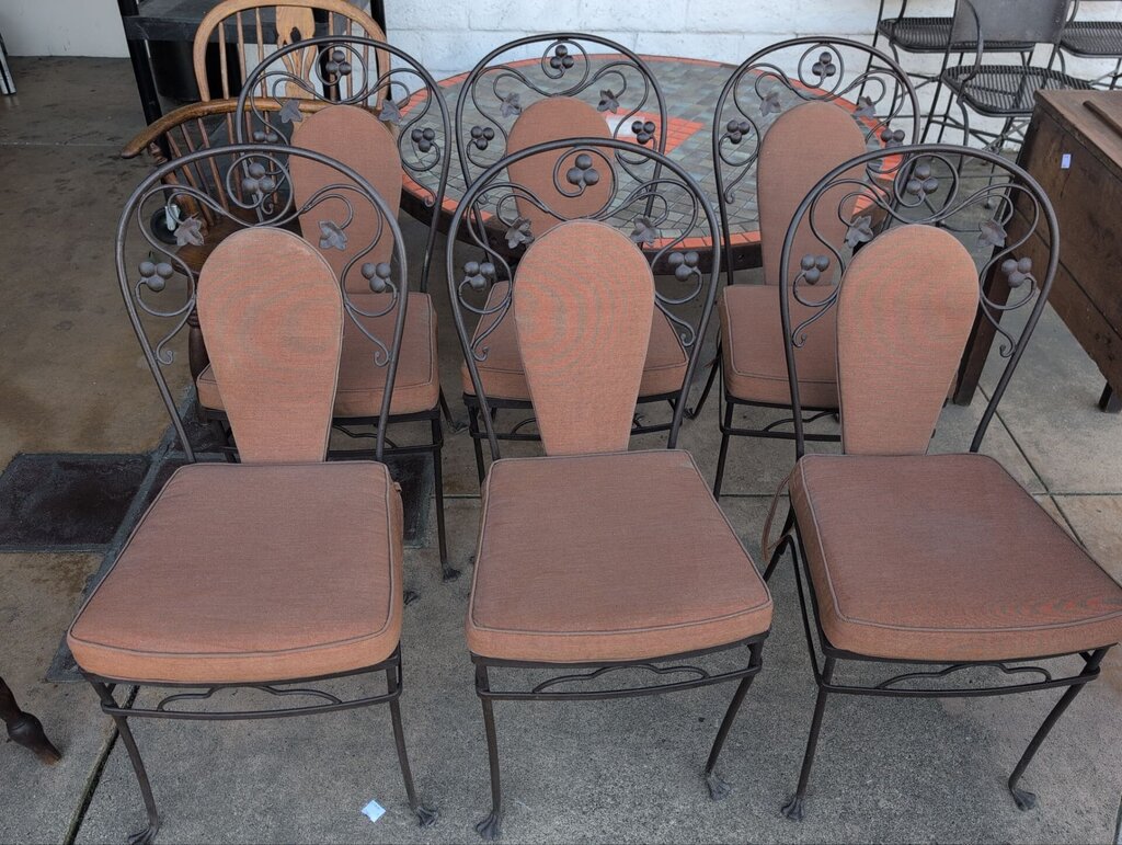 A set of six original Salterini wrought iron patio chairs with decorative backs and upholstered seats.