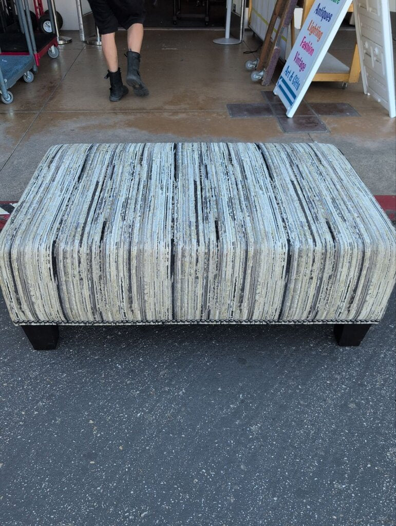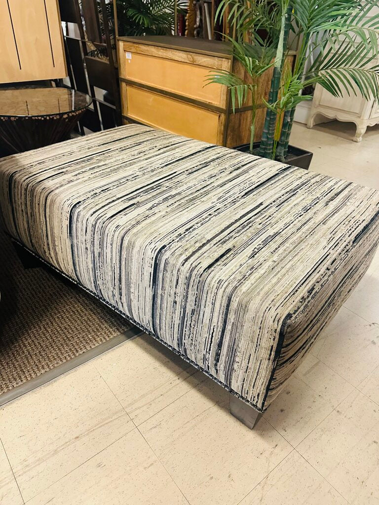Rectangular upholstered ottoman in tan, black, and cream striped fabric.