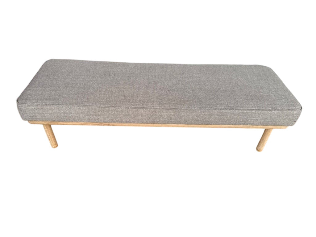 An upholstered bench with a rectangular cushioned seat, covered in gray textured fabric and supported by light wood legs. The construction presents a simple, low-profile silhouette and solid joinery, making it suitable for entryways, bedrooms, or living areas as seating or a footrest. The restrained design draws on mid‑century modern influences, yielding a versatile piece that blends with a range of interiors.