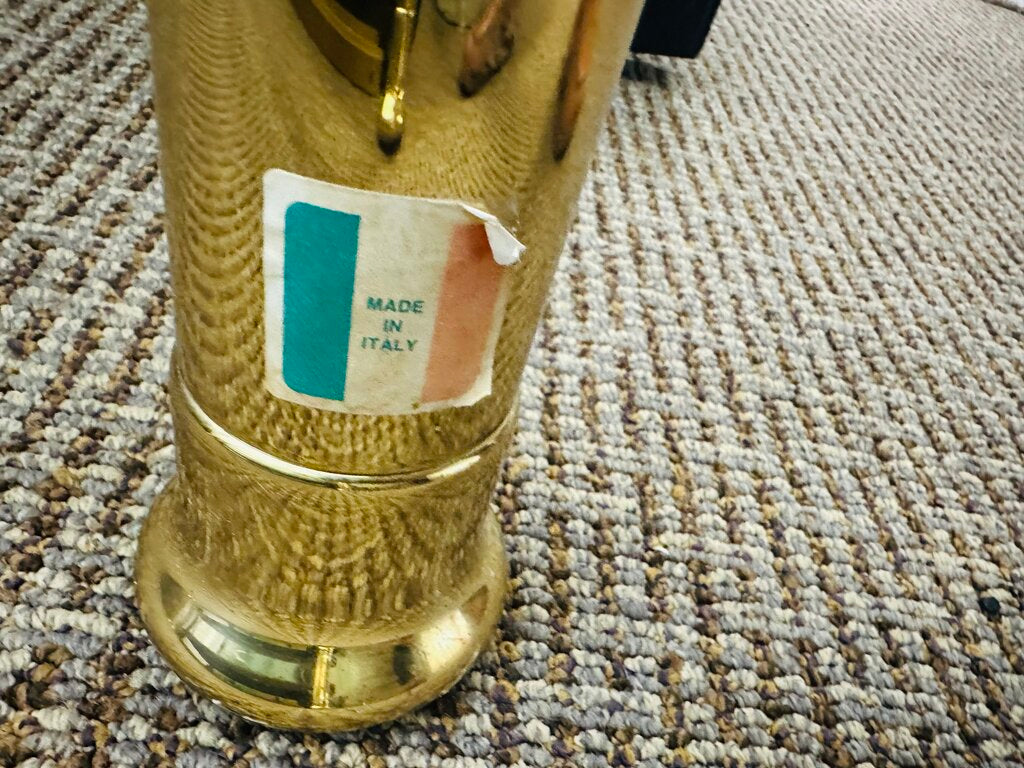 Vintage Italian Pelicano Brass Bed, including headboard, footboard, and sidings, is presented as a complete bed frame with a polished gold-tone brass finish. The headboard and footboard feature curved rails with decorative joints at the posts, while the sidings form the mattress enclosure with black metal rails providing mattress support.