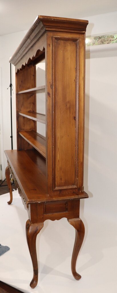 SpecificationsNotable visual characteristics include the four fixed display shelves in the upper section with a moulded cornice, a long lower work surface, and a decorative scalloped apron that echoes traditional country-house furniture. The curved cabriole legs introduce a touch of graceful proportion, while the brass hardware on the small drawers adds a subtle metallic contrast. The piece shows the warm patina of age and the tight joinery typical of solid oak construction, offering a sturdy, enduring presence.