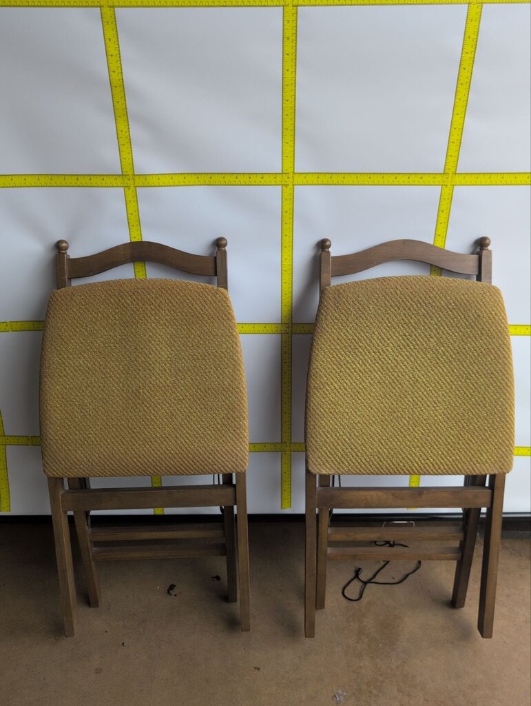 Pair of vintage wood folding chairs featuring upholstered seats in mustard-toned fabric. The solid wood frames provide a simple, timeless silhouette and offer lightweight, portable seating suitable for dining, casual gatherings, or multi-purpose spaces. The mustard upholstery introduces a warm accent that works with a variety of decors while remaining durable for regular use. When not needed, the chairs fold for compact storage, making them a practical option for temporary seating during events or seasonal entertaining.